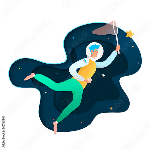 Mladá žena spí v noci a roztomilý pet pes spí u nohou na posteli, plochý vektorové ilustrace. Hvězdná noční obloha pozadí. Sladký sen.