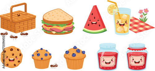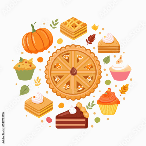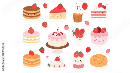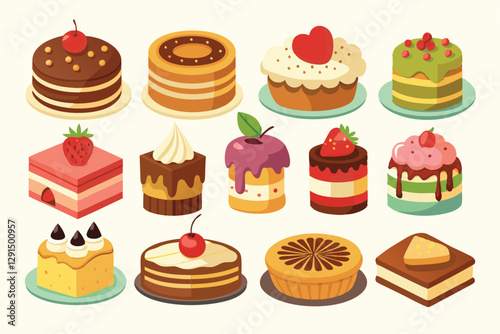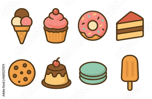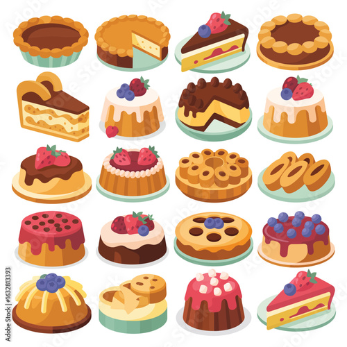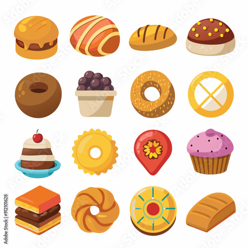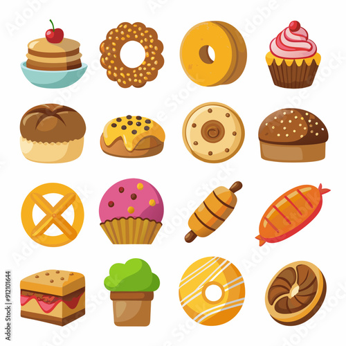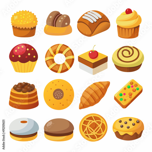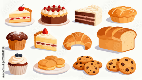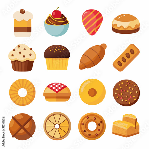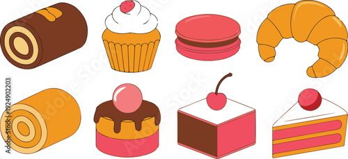 Yummy sladký dezert set, ploché vektorové izolované ilustrace. Muffin, dort, kobliha, sušenka s čokoládou, oplatka, preclík, francouzský croissant a koláč. Cukrárna, Cukrárna a pekárna.