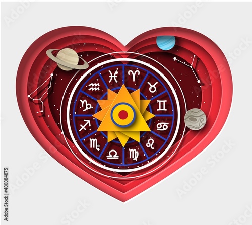 Zodiac kolo s dvanácti horoskop znamení uvnitř srdce, vektorové ilustrace v papírové umění stylu. Banner predikce astrologie, šablona karty. Kompatibilita lásky zvěrokruhu.