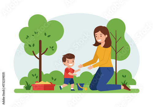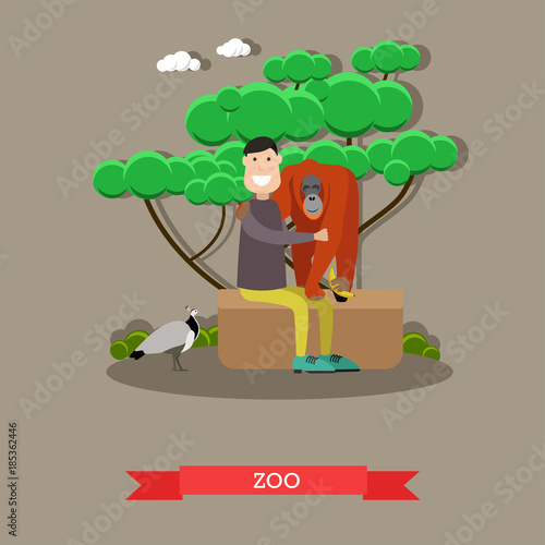 Vektorová ilustrace turistického muže objímajícího opici. Peafowl putování mezi lidmi. Zoo zvířata plochý styl designu.
