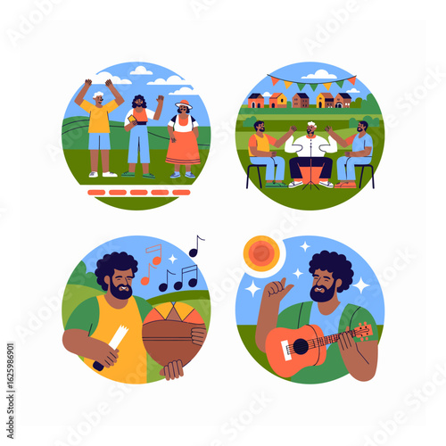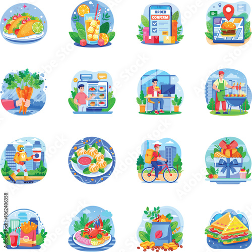 Zoo set. Vektorové ploché ilustrace. Vstup do Zoo, značení s exotickými, lesními a polárními zvířaty. Šťastná rodina krmení mrkev dítě žirafa, děti sledují opice na lanovém žebříku a houpačky.