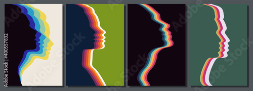Vintage Color Silhouettes of Female Faces, Vector Set