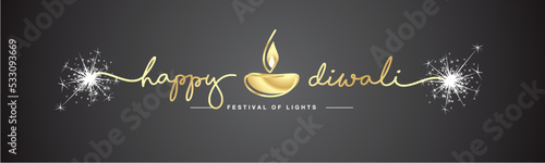 Happy Diwali festival of light gold handwritten calligraphy typography golden diya oil lamp white sparkle firework black background