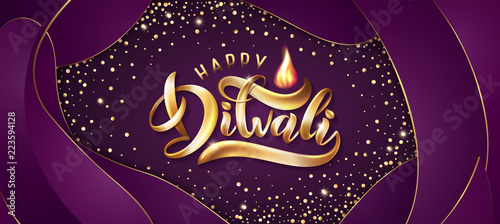 Diwali festival modern luxury design in paper cut style with golden pattern and oil lamp on violet textured background. Holiday template for branding, greeting card, banner, cover, flyer or poster