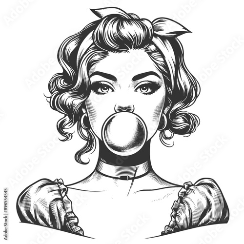 pin-up girl playfully blowing air kiss, perfect for romantic themes sketch engraving generative ai fictional character vector illustration. Scratch board imitation. Black and white image.