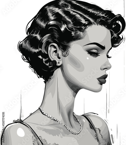 Pin-up girl retro waitress in classic uniform, serving food with poise elegance sketch engraving generative ai fictional character vector illustration. Scratch board imitation. Black and white image.