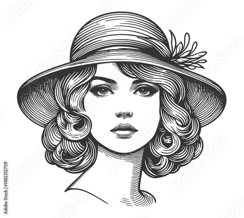 woman in a leather jacket, tube top, and shorts with flowing bob hairstyle and bold attitude sketch engraving generative ai fictional character vector illustration. Scratch board. Black and white.