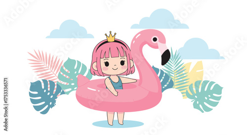 A cute cartoon girl wearing a crown sits on a pink flamingo float surrounded by tropical leaves and clouds.