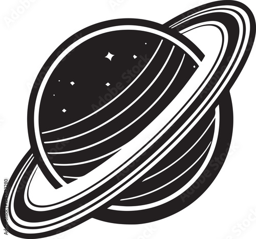 A black and white illustration of a planet with ring system in space silhouette