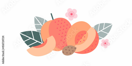 Plum fruits. Flat illustration. Whole and cut fruits, leaves, plum pits and flowers. Illustration can use for jam or marmalade, for label, packaging design, adv products and posters