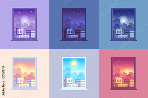 Different time cityscape. City view landscape in morning day afternoon evening nighttime, night long skyline of urban construction international times, splendid vector illustration