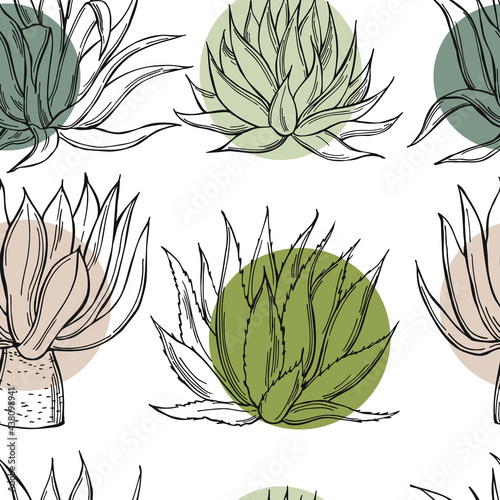 Aloe vera background, agave plant seamless pattern. Succulent wallpaper with line icons of aloevera leaves. Herbal medicine vector illustration green white color
