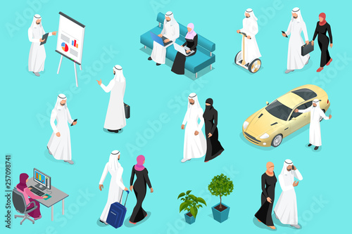 Arab business man vector character set. Saudi arab characters isolated in white background with phone and sunglasses for professional arabian boss design collection. Vector illustration.