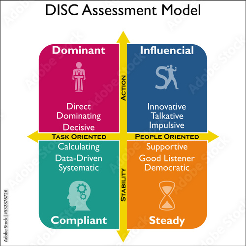 DISC assessment model for four main personality profiles of Dominance, influence, steadiness and conscientiousness