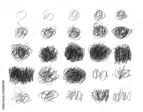 Hand Drawn Scribble Pencil Line Set. Scratch Texture Sketchy Graphic Collection. Sloppy Hatching, Highlighter for Modern Design. Vector Illustration Isolated on White Background. Ballpoint Round Swirl