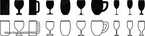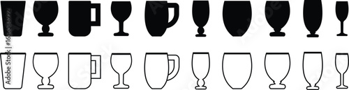 Drinkware icon set, glass cup mug wine goblet beer collection in flat and line style, black silhouette group, bar utensil bundle, beverage container pack, drink synonym vector