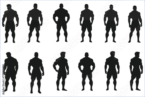 Bodybuilder man silhouette set, Body builder flexing and lifting weights, Man standing vector silhouette set