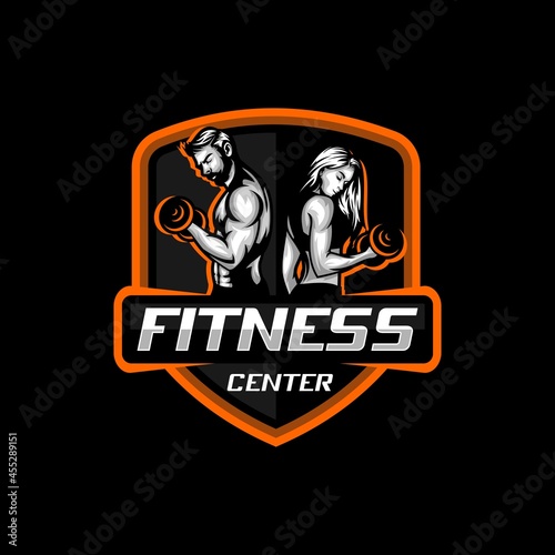 Fitness club logo or emblem with woman and man silhouettes. Woman and Man holds dumbbells.