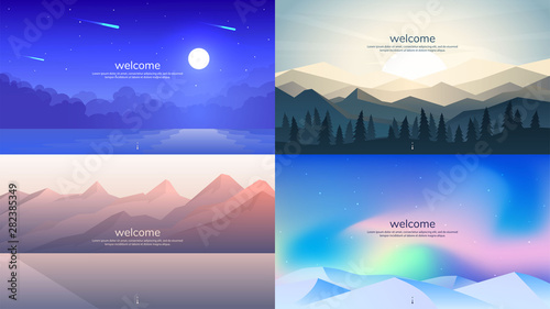 Aurora borealis landscape. Card, poster, banner template. Set of abstract background card. Flat style. Vector illustration.