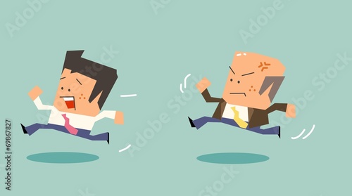 Angry boss character kick worker character ass. Financial crisis. Graph down. Vector flat cartoon illustration