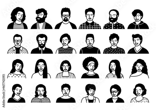 Silhouette set of persons, avatars, people heads of different ethnicity and age in flat style. Multi nationality social networks line people faces collection.