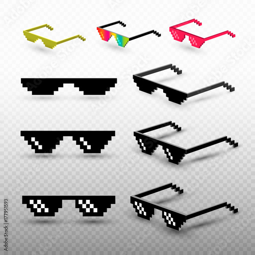Set of pixel glasses isolated on transparent background. Thug life meme glasses. Mock up template ready for your design. Vector illustration.