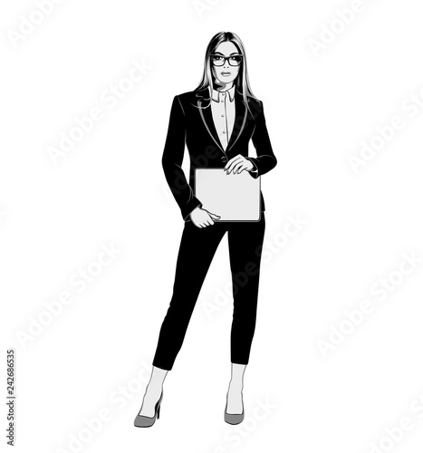 Business woman wearing a suit on a white background. Black and White Vector illustration.
