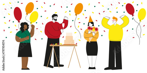 The team in the office celebrates the birthday of their colleague. The friendly boss raises a glass and says a toast to the health of the employee. Vector minimalistic illustration in a flat style