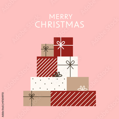 Gifts, present boxes pile, stack. Festive holiday surprise packages in paper wrapping, bow decoration. Many wrapped giftboxes heap for party. Flat vector illustration isolated on white background