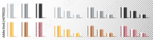 Realistic metal cylinder pedestal set. Steel, cast iron, aluminum, ferrous, copper, brass pipes with shadow. Glossy detailed pipe. Round chrome column stand. 3d geometric shape vector illustration