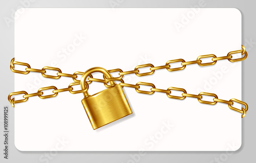 One locked metal padlock with chain in front view isolated illustration, security tool, hinger equipment for protection against burglary