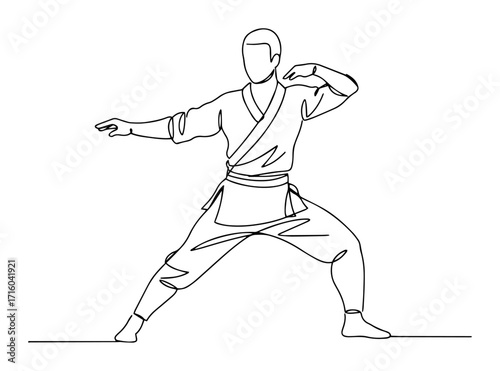 Single one line drawing male athlete in powerful stable stance, hands in defensive position. Discipline, focus, fluid motion of Shaolin routine. Continuous line draw design graphic vector illustration