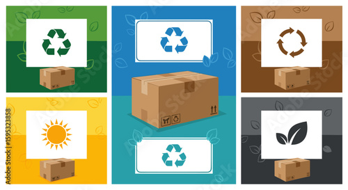 A collection of images showcasing sustainable packaging solutions, with cardboard boxes and recycling symbols, emphasizing eco-friendly practices and materials for a greener future.