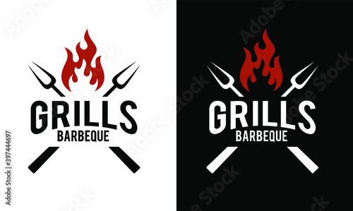 barbecue grilled vector logo template. BBQ, grill food and restaurant icon with fire icon