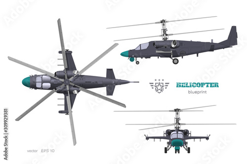 Engineering blueprint of helicopter. Helicopters view: top, side, front. Industrial drawing