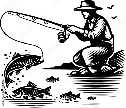 Silhouette of Man Catching Bass Fish with Rod Perfect for Vintage Style Fishing Artwork
