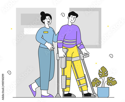 Patient with disability learning to walk with prosthesis, rails. Rehab physiotherapist, person after amputation. Physiotherapy and rehabilitation. Flat vector illustration isolated on white background
