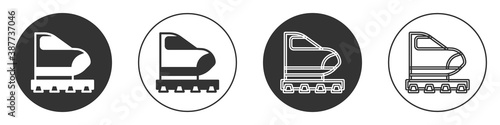 Black High-speed train icon isolated on white background. Railroad travel and railway tourism. Subway or metro streamlined fast train transport. Circle button. Vector.