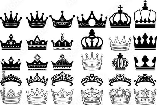 Crown icons. Queen king crowns luxury royal crowning princess tiara heraldic winner award jewel royalty monarch black flat silhouette, vector set.