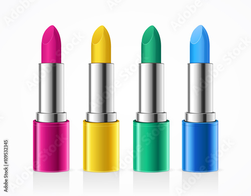 Set of color lipsticks. Red lipstick, pink lipstick, orange lipstick, wine lipstick.Red lipstick set isolated on white background, RGB vector created with gradient mesh