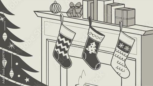 Decorative Christmas mantel with stockings and gifts, cozy holiday illustration