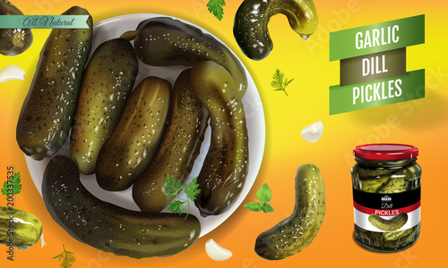 Homemade pickled cucumber. Clip-art of marinated food for packaging, label, menu, signboard or showcase. Fermented veggies, crunch gherkin with salt. Healthy vegetarian food