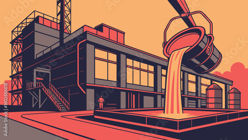 Steelworks Vector Illustration with Resource Mining, Smelting of Metal in Big Foundry and Hot Steel Pouring in a Flat Cartoon Background Design