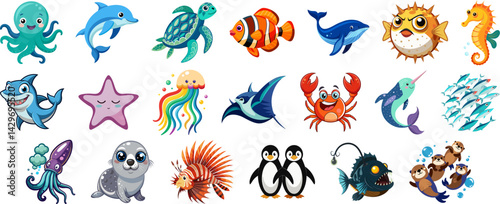 A collection of cute cartoon sea creatures and underwater plants in a vibrant ocean environment.