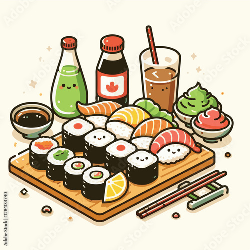Isometric Sushi Dinner Set Illustration Salmon Nigiri Maki Rolls Chopsticks Soy Sauce Japanese Food Menu Graphic