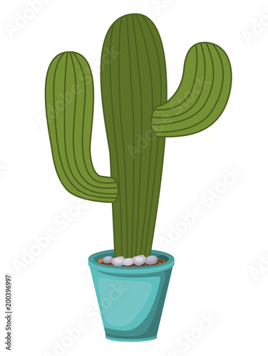 A vibrant green saguaro cactus illustration with three arms, small spines, and blooming red flowers.