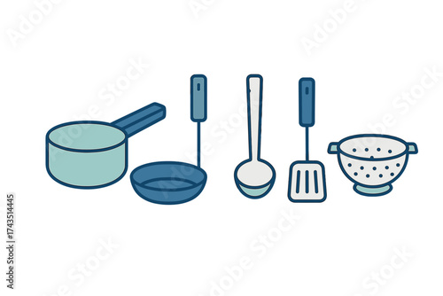 Minimalist kitchen utensil illustration featuring cooking tools and equipment on a white background