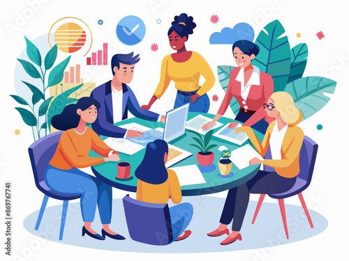 Vibrant vector illustration depicting a collaborative business growth concept with diverse team members working together to achieve success, symbolized by upward-trending bar charts, gears, puzzle