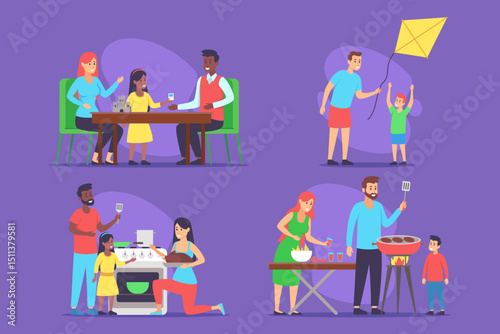 Silhouette family members engaged in various activities like reading watering plants and using devices