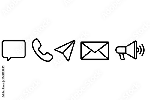Outline icons set for digital communication featuring speech bubble, telephone, paper plane, envelope, and megaphone symbols